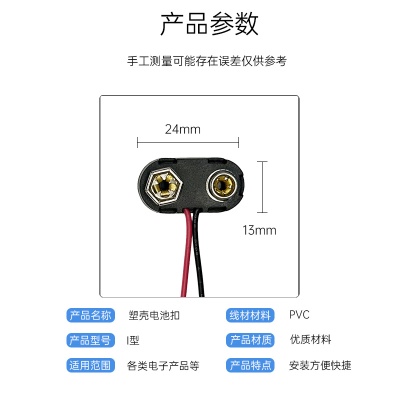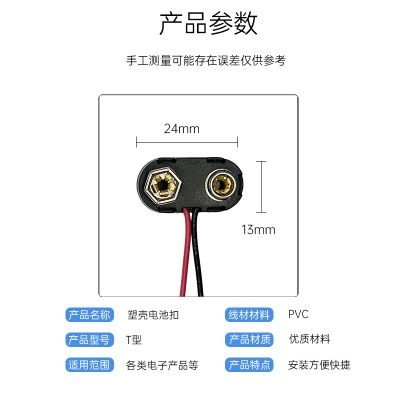 定制T型9v电池硬扣 玩具仪器连接线夹铜线端子接头塑壳9v电池卡扣